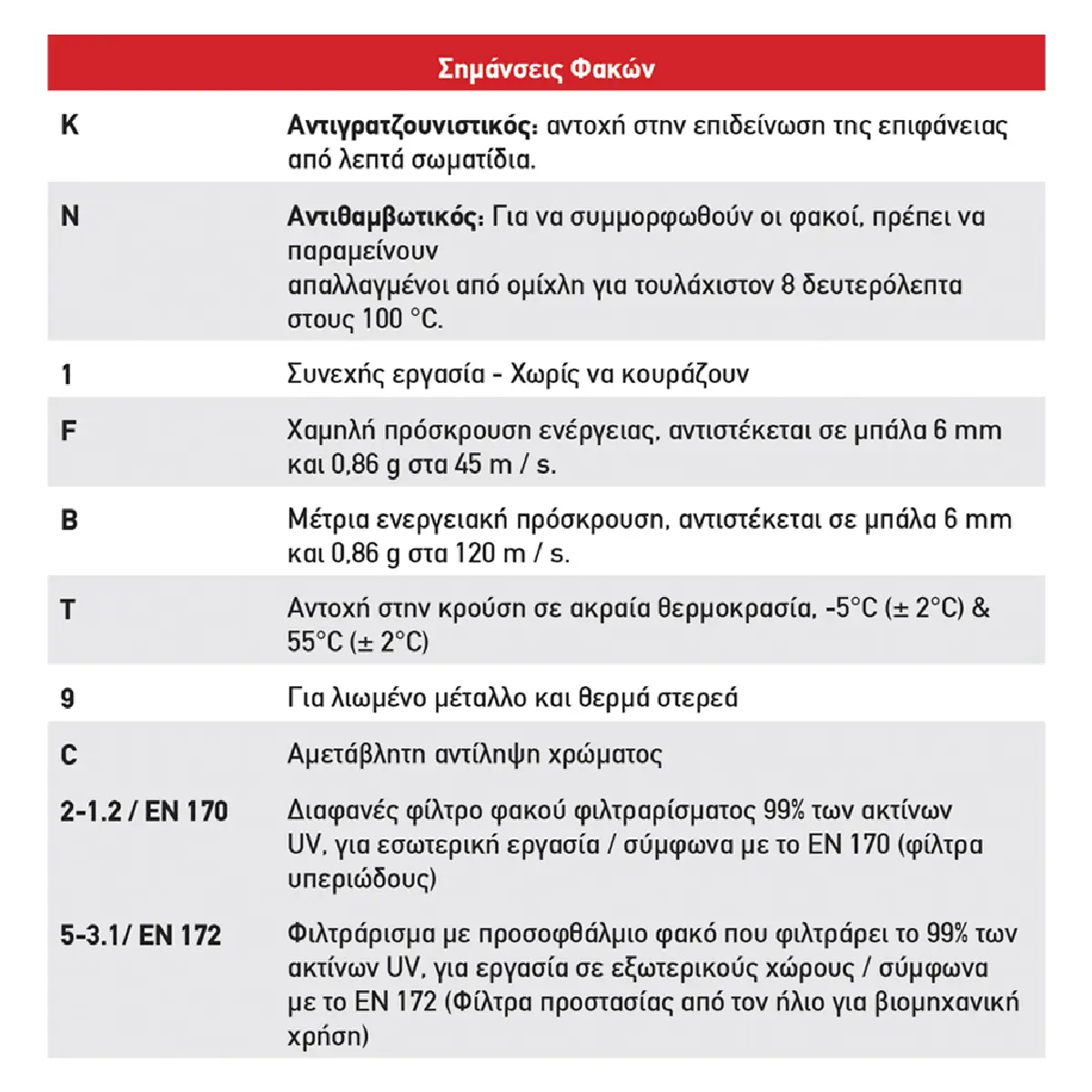 Πληρούν τους κανονισμούς EN 166:2001 και διατίθενται με φακούς EN 170:2001 (clear lens) και EN 172:2001 (smoke lens).