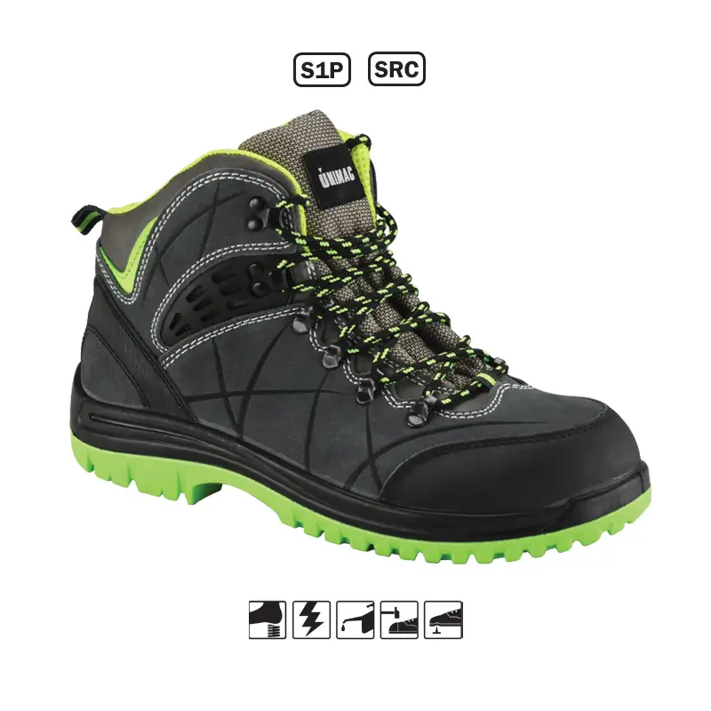 UNIMAC: ΜΠΟΤΑΚΙΑ ΕΡΓΑΣΙΑΣ ΑΠΌ ΔΕΡΜΑ SUEDE – S1P,SRC – ΓΚΡΙ/ΠΡΑΣΙΝΑ – EN ISO 20345:2011 – ΜΕΓΕΘΟΣ 40