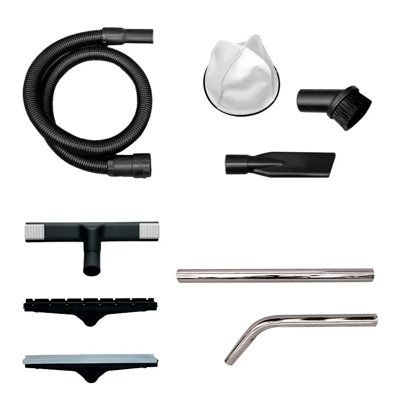 Συνοδεύεται με σωλήνα σπιράλ με λαβή, 2 προεκτάσεις, εξάρτημα σχισμής, πέλμα υγρών & σκόνης, φίλτρο πάνινο