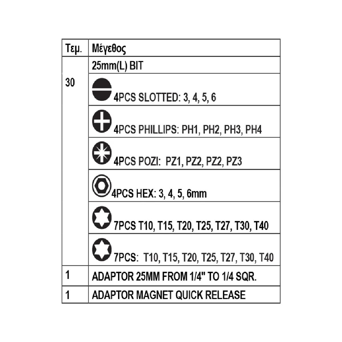 Υλικό: Cr-VΜέγεθος σπειρώματος: 1/4″Μέγεθος: 1/4″Τύπος: 44287Τεμάχια ανά σετ: 32.Μαγνήτης: 1